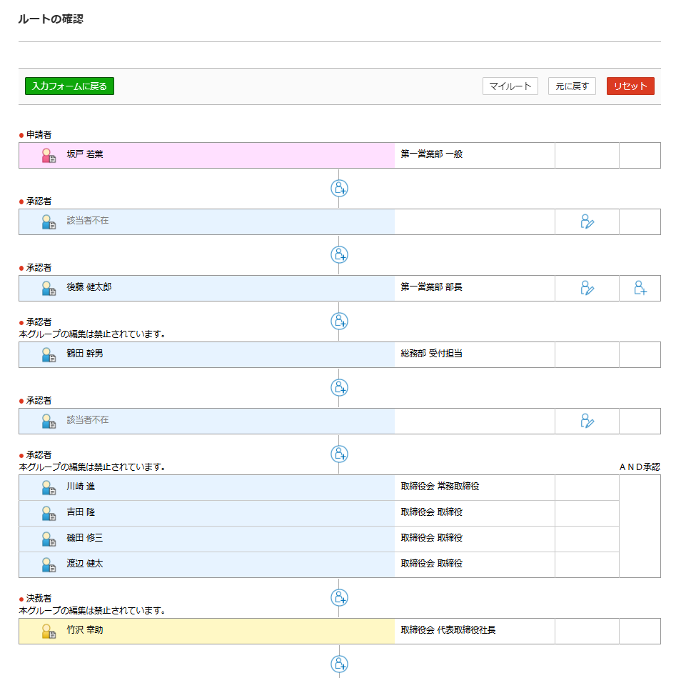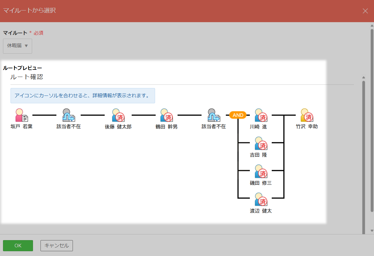 マイルートを選択すると、現在の設定にもとづいて代理・代行申請者または代理・代行承認者が適用されます。![]()